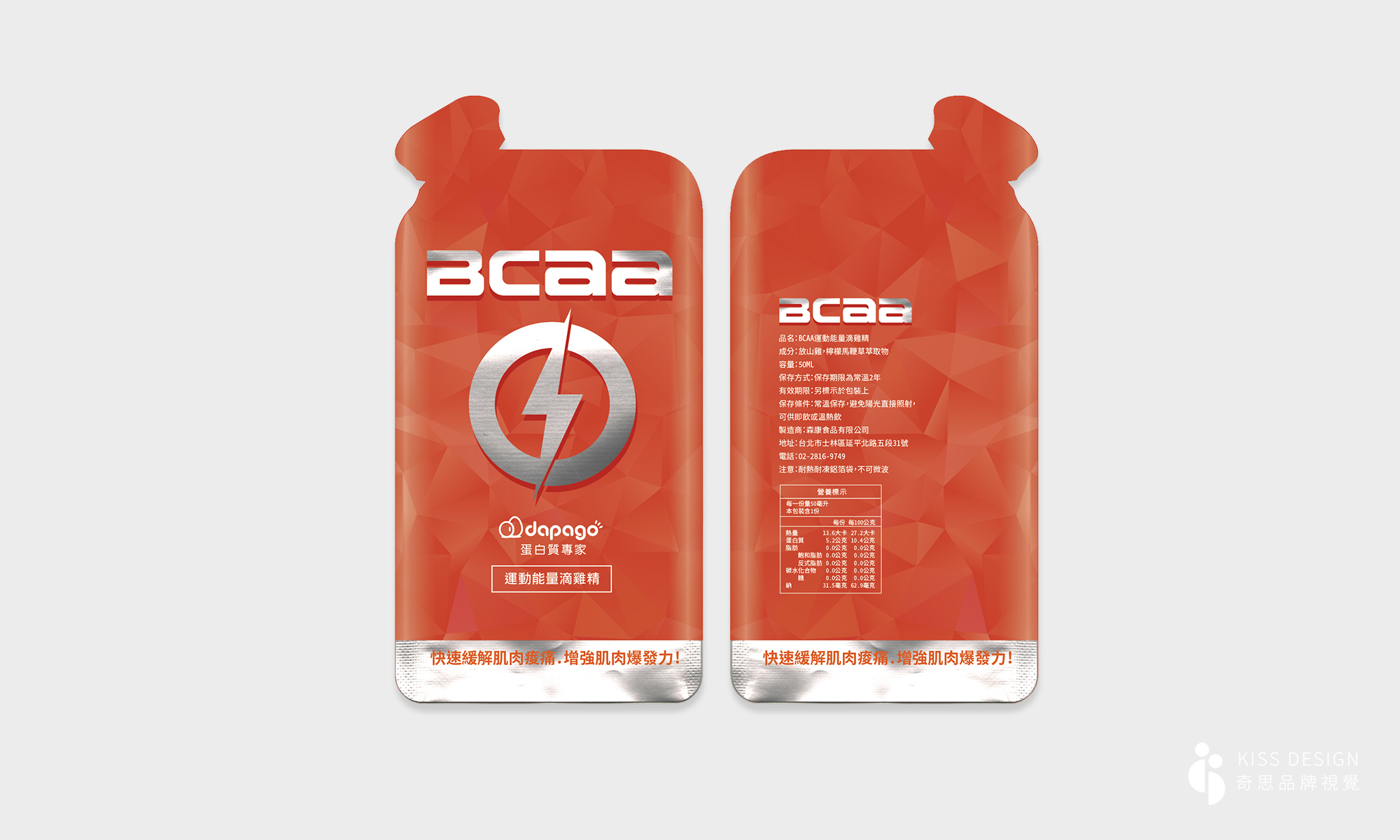 DAPAGO-BCAA運動能量滴雞精包裝設計,BCAA(支鏈胺基酸)運動能量滴雞精是結合「高濃度小分子蛋白」與「天然抗疲勞成分」的健身補給,能快速促進能量代謝、緩解運動後肌肉痠痛。天然、吸收快、低熱量等優勢,適合運動員、健身族與高壓疲累的上班族進行即時體力恢復