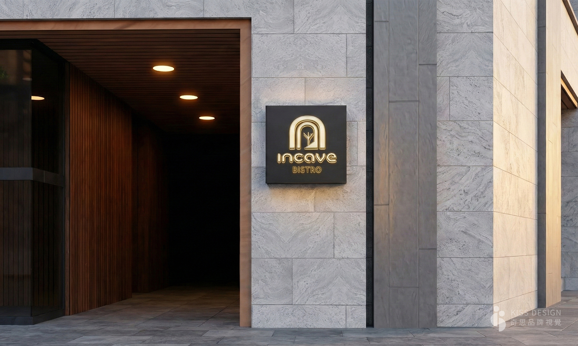 INCAVE餐酒館-視覺設計,商標設計用一層又一層的洞穴中發現祕境,黑金色彩,呈現神祕且具個性的品牌調性,包含商標、招牌、菜單設計