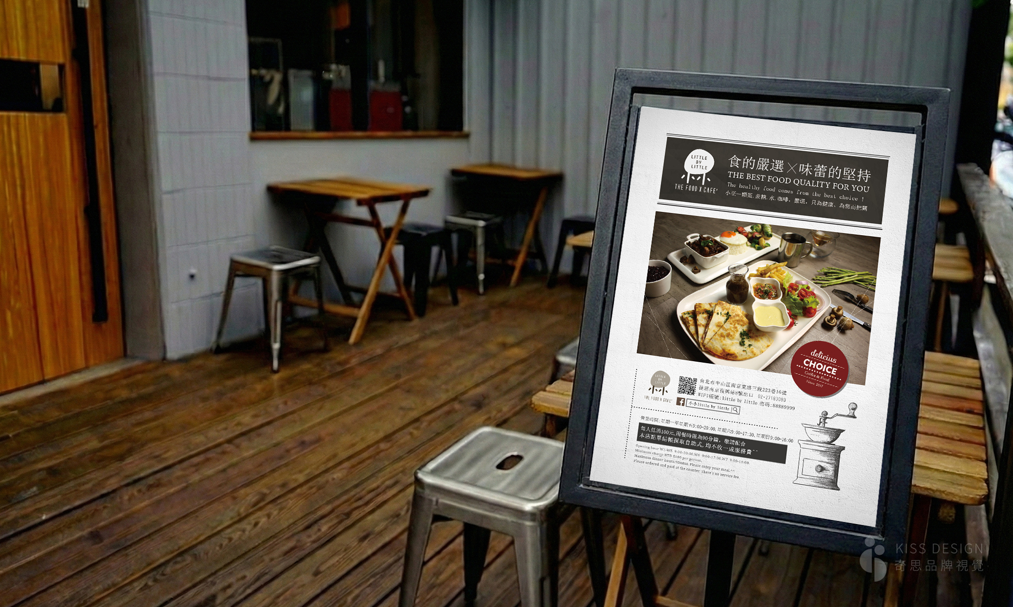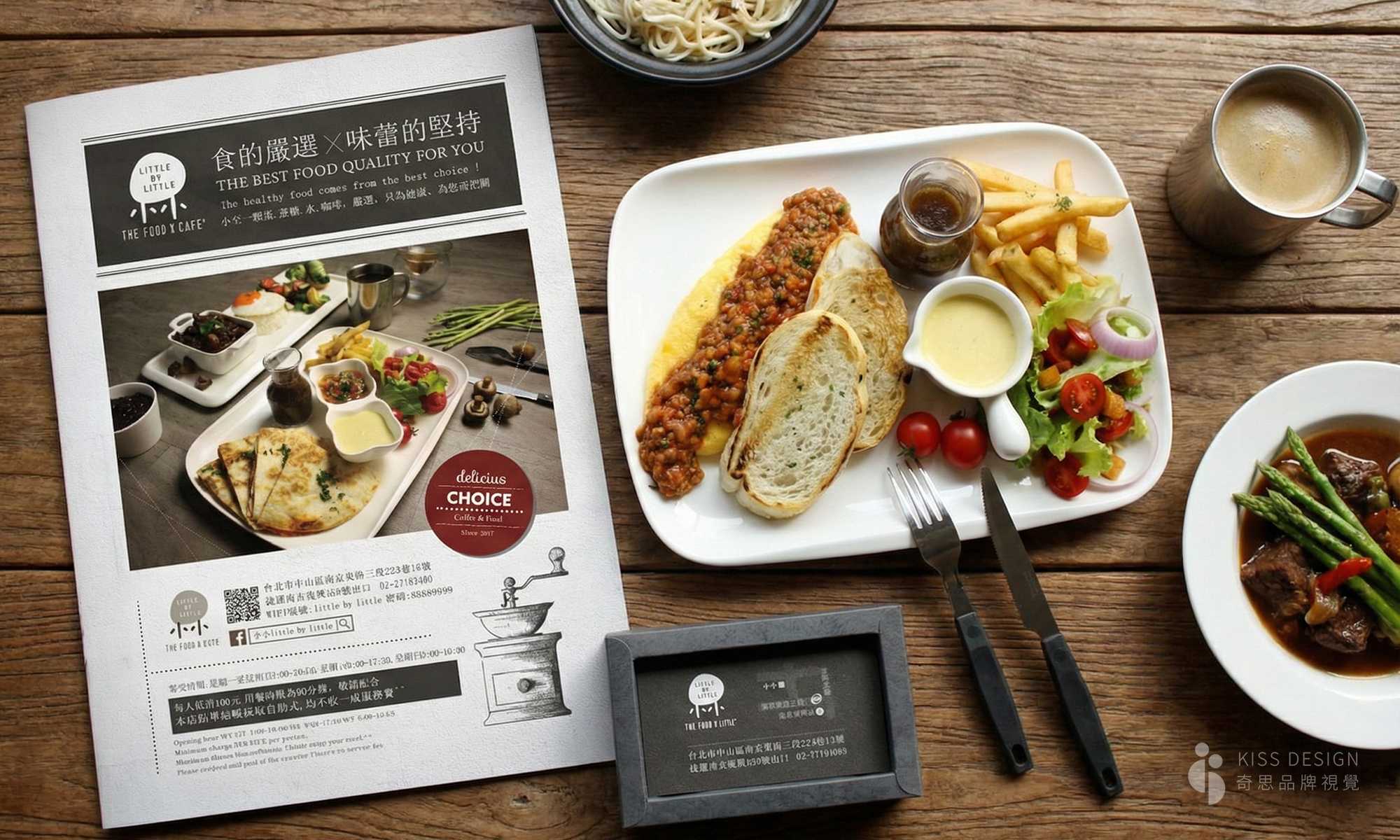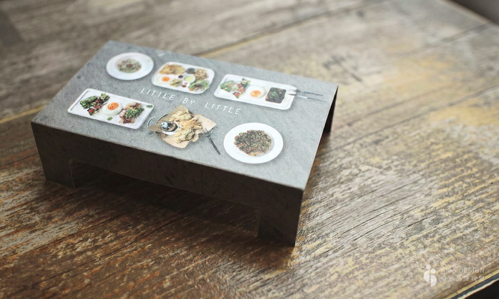 小小美味餐廳-視覺設計,名片是可以變成立體餐桌,上面擺滿美味的招牌菜色,整體使用黑鐵、木頭呈現具個性又帶點可愛的品牌調性,包含商標、招牌、菜單設計、名片、落地架、店外觀設計